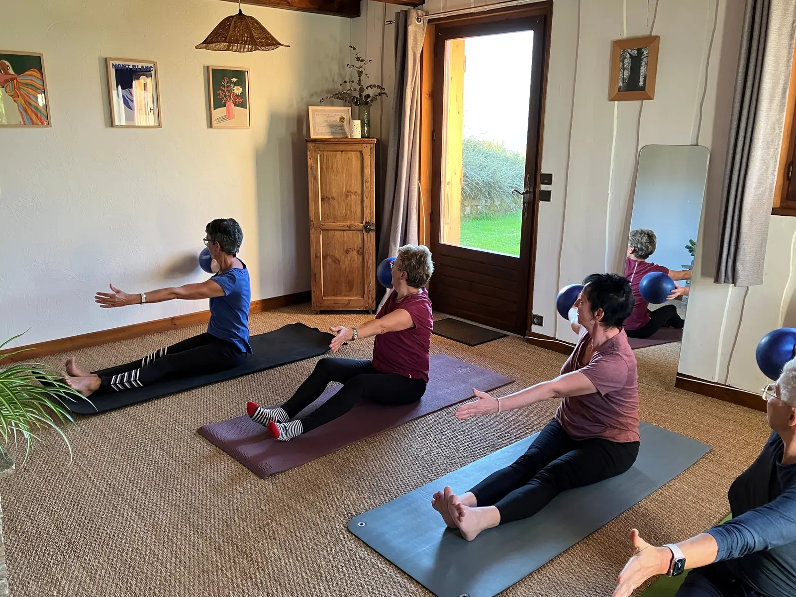 Authentischer Pilates-Kurs am Boden mit Joy, in kleinen Gruppen von 3 bis 4 Personen, 25 € pro Stunde.