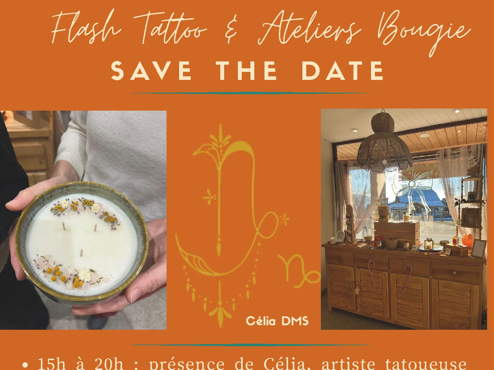 Morgane vous propose deux ateliers pour fabriquer votre propre bougie 100% personnalisée autour d'une pause gourmande. Dans le même temps, Célia, artiste tatoueuse, sera présente à la boutique pour vous proposer ses tatouages flash astro de 15h à 20h.