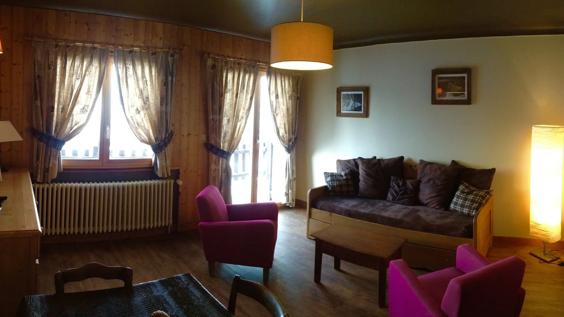 appartement de 6 pers dans chalet situé à 200 m du centre du village, 350 m du départ des pistes. Vue exceptionnelle sur les montagnes (Chaine des Aravis), au calme en pleine nature