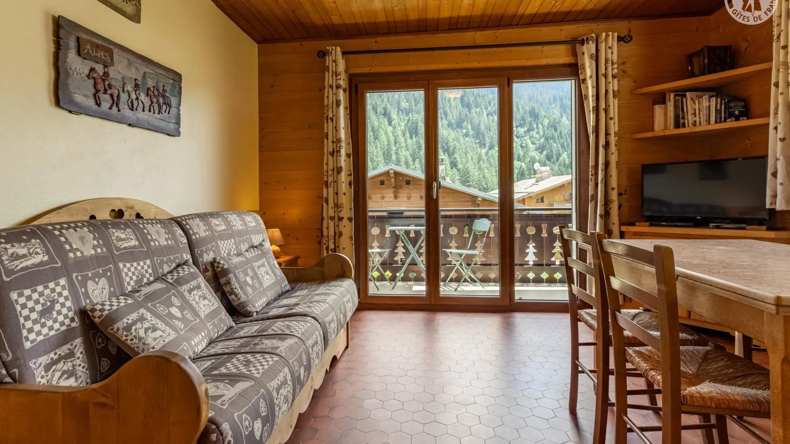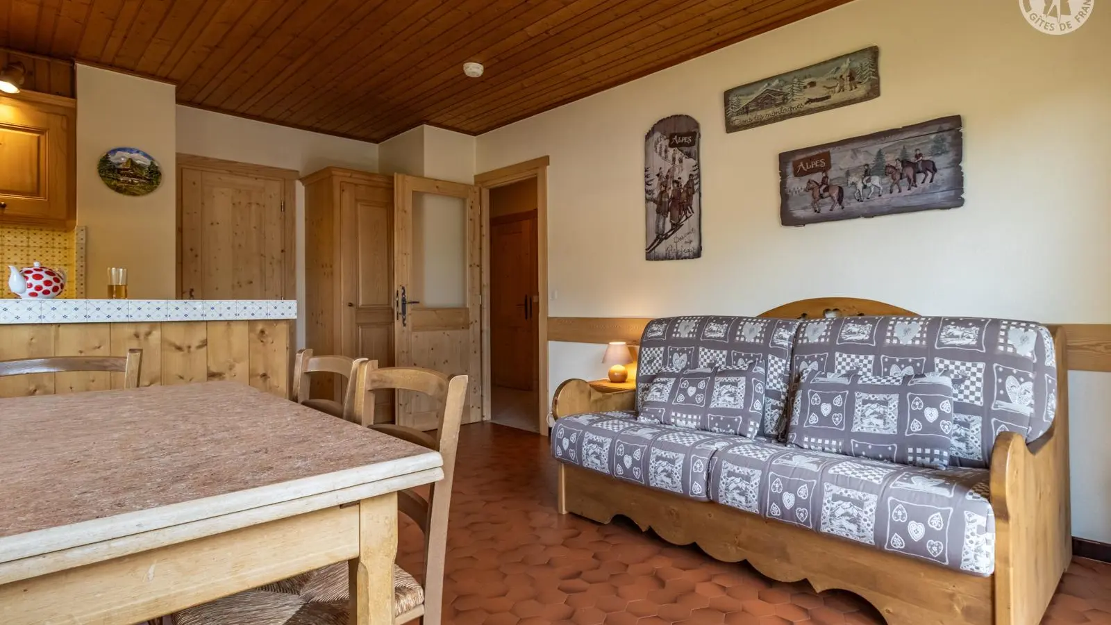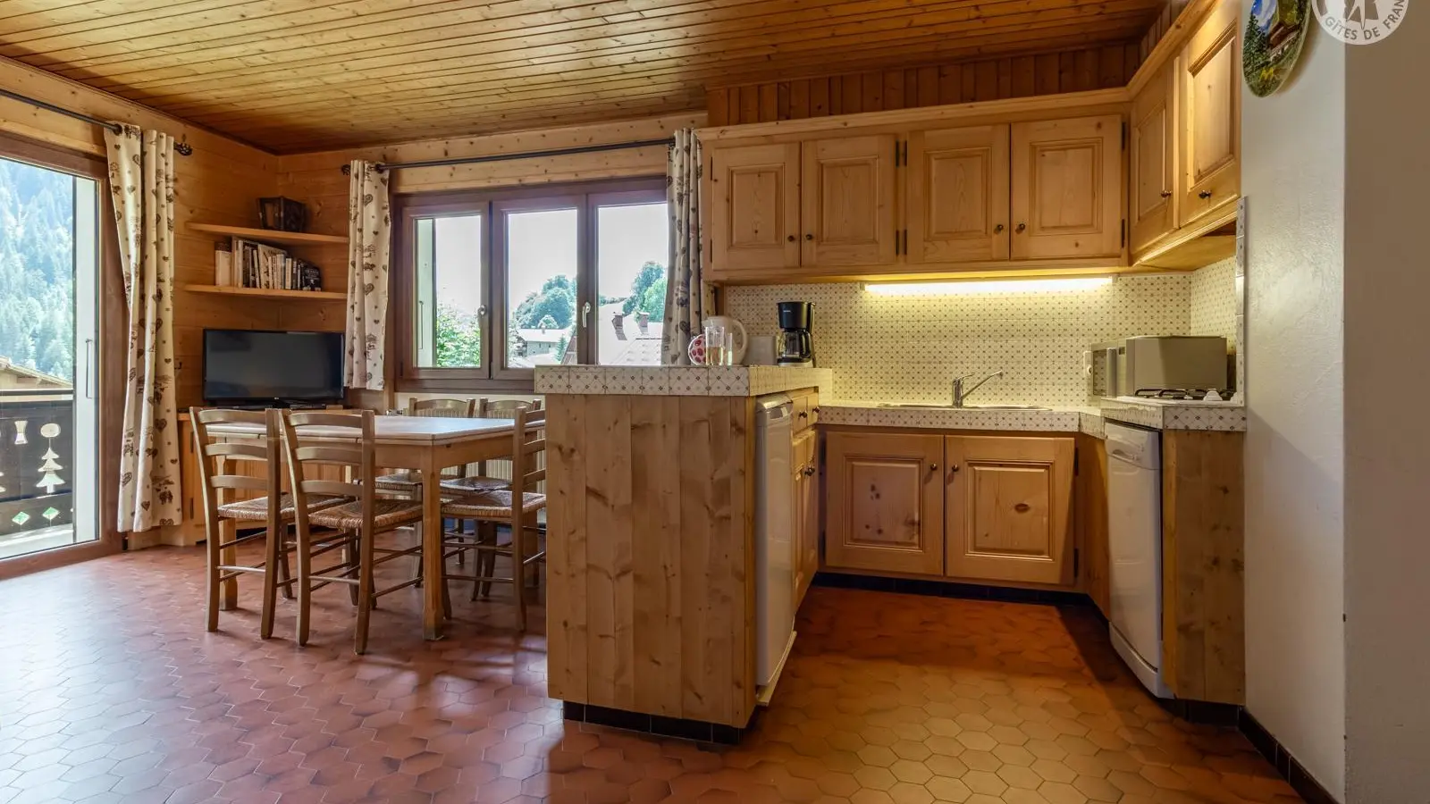 La pièce à vivre (donnant sur le balcon) est composée d'un séjour (télé, lecteur DVD, canapé clic-clac avec 1 traversin et 2 oreillers) et d'un coin- cuisine séparé du reste de la pièce par un bar à l'américaine ; le coin-cuisine est équipé d'un lave-vaisselle, d'un réfrigérateur, d'une table de cuisson 4 feux gaz, d'un mini-four et d'un micro-ondes.