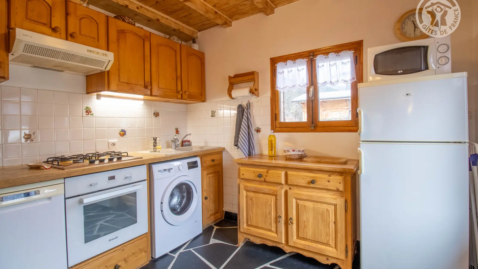Cuisine : lave-vaisselle, four électrique, 4 feux gaz, lave-linge, réfrigérateur, congélateur, micro-ondes, appareils à raclette et à fondue.