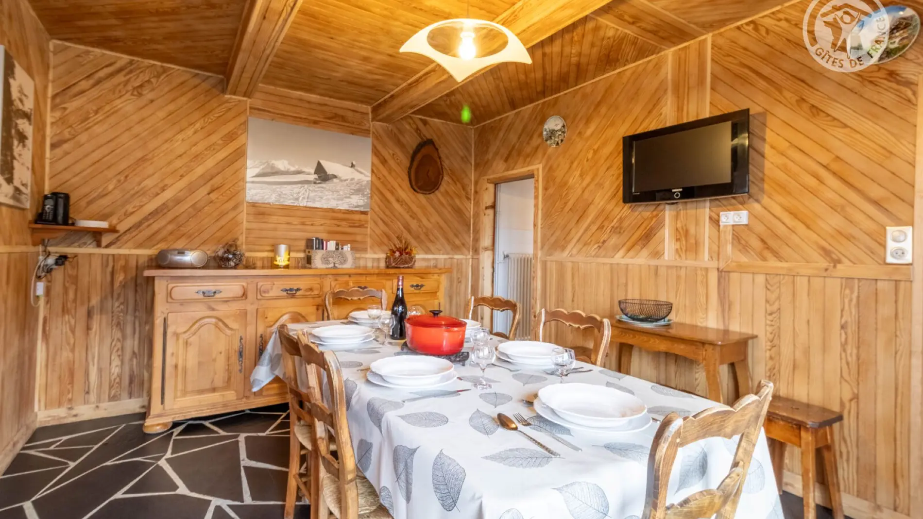Salle à manger / séjour : table avec 6 chaises, télévision avec chaînes Free, Fibre, lecteur DVD, lecteur CD, fauteuil, canapé.