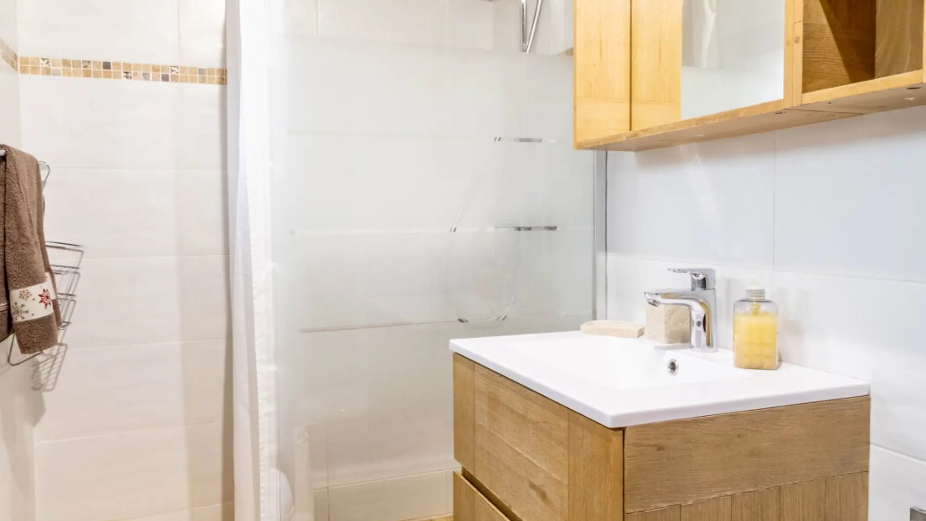 Salle de bain : Douche à l'italienne, meuble vasque, sèche-cheveux, 1 WC.